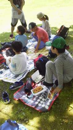 ハイキングを終えて、お弁当の時間です。みんな夢中で食べています。頑張ったから、お腹が空きましたね。