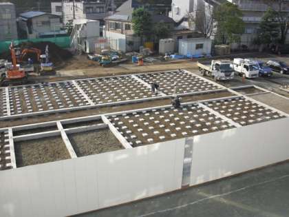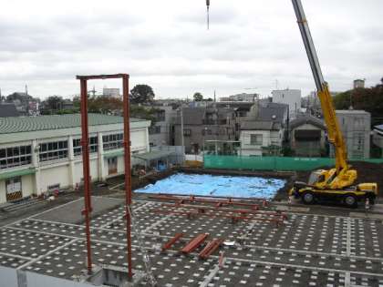 仮設校舎の工事が進んでいます。地面にほられた溝は鉄骨やコンクリートで固められ、基礎の部分が完成したようです。今日からは大きなクレーンをつかって柱を建てています。この作業中は子どもたちには、工事のフェンス付近には近づかないように指導します。登校下校のときは「犬走り」部分を歩きます。