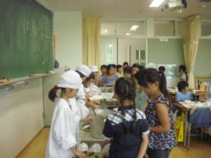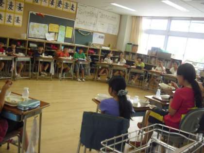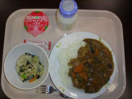 1学期 最後の給食は、夏野菜のカレーライス・かむかむ海藻サラダ・いちごアイスでした。子どもたちの好きなメニューです。仲良く配ぜんして、おいしくいただきました。最後なので、輪になってみんなの顔を見ながら食べている学級がありました。栄養士さん、給食調理員さん、毎日ありがとうございました。