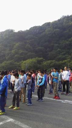 晴れの朝、眠たい様子の子どももいますが、みんな元気です。さあ今日もいい日にしましょう。