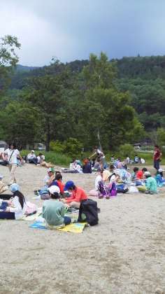 湯の湖のほとりで、お弁当を食べました。パクパクとよく食べていました。
