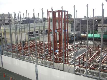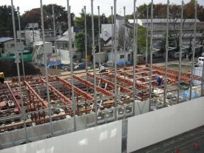 仮設校舎の建設が進んでいます。子どもたちは工事のスピ−ドに驚いています。休み時間に工事の様子をじっとみつめている子もいます。もう窓の一部や階段がとりつけられたようです。ずいぶん校舎らしくなってきました。