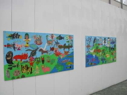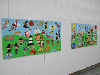 工事用のフェンスに子どもたちがつくった絵をかざりました。絵は学級で1枚ずつつくったので全部で12枚あります。テーマは「夢」です。それぞれの絵は、子どもたち一人一人の作品を組み合わせてつくってあります。校庭が明るく、楽しくなりました。ご来校の折にぜひご覧ください。