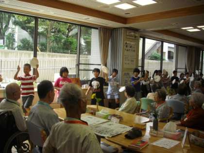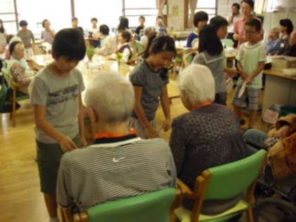 4年生が2回目の「上北沢ホーム訪問」を行いました。お年寄りの方とのふれあいを通して、自分たちにできることを考え、心を伝える学習です。子どもたち一人一人が手づくりのメダルをプレゼントし、「エイサー」を披露したり合唱「ふるさと」を聞いていただいたりしました。その後は、折り紙やあやとり、お手玉などを一緒に行うふれあいタイムで楽しく過ごし、握手をしてお別れしました。お年寄りの皆さんに喜んでいただけたことで、どの子もみな幸せそうな笑顔でした。