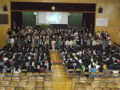 『よろこびのことば』では5,6年生が舞台で上北沢小学校の70年の歴史をふりかえり、感謝の気持ちをあらわしました。全員合唱『ふるさと』では心が一つになりました。
