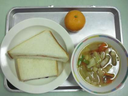 ・セレクトジャムサンド ・牛乳 ・白いんげんの田舎風スープ ・くだもの(みかん)です。