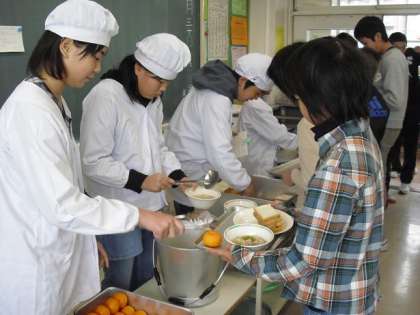 今日は、いちごジャムサンドかブルーベリージャムサンドのどちらかを選ぶセレクト給食です。7回めになると給食室で各クラスに分けて数える作業もスムーズに進みます。給食が各クラスに運ばれたあとも、上手に配膳していました。(写真は6年1組の配膳の様子です。)