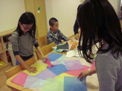 2人組になり、相談して上小75歳おめでとう!という気持ちを、旗に表しました。それぞれ、お花紙をどう使って75を表現するか、いろいろと工夫をしていました。