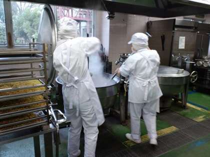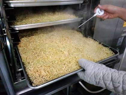 給食では、どの料理も75度・1分以上加熱することが原則です。炒めものは中心温度を上げるのに時間がかかるため、給食室では麺を一度オーブンで焼いて、釜で炒めた野菜に加えて手際良く仕上げていきます。全校430人分を2釜に分けて調理します。