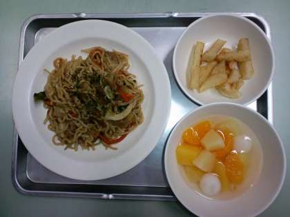 ・ソース焼きそば ・牛乳 ・スパイシーポテト ・フルーツ白玉 です。
