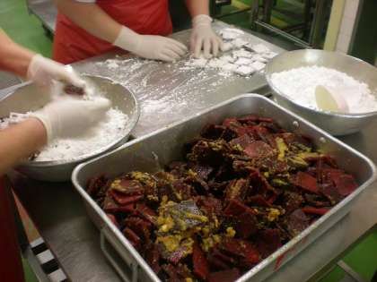 どうして鯨の肉は黒っぽいのか?その答えが1枚目の写真です。下味つけのあと衣をつけるところの写真ですが、鯨肉は色が濃いのが特徴です。(※下味にしょうゆも使っているため、その色も少し入っています)これを油で揚げると、2枚目の写真のような仕上がりになります。
