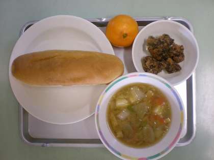 ・ジャムコッペパン ・牛乳 ・鯨の竜田揚げ ・野菜のみそ汁 ・くだもの(みかん) です。