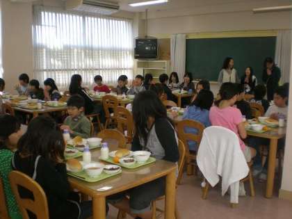 歯が生え変わる時期の1・2年生は、ちょっと硬い部分もある鯨肉をよくかんで食べていました。ランチルームで食べていた5年1組さんは、「なかなか出ないけどこれ、おいしいよね」「どうして鯨の肉は黒っぽいの?」などと言いながら食べていました。