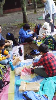 野鳥の森公園まで歩きました。お弁当です。みんな、パクパク食べています。