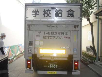 太子堂調理場の場長と栄養士から、調理場の概要や今日の献立などについての話をしていただきました。4月から上北沢小学校が加わって約5500食を調理する施設です。給食をのせたトラックが学校に到着したのが12時少し前、今日のカレーうどんの出来上がり時間は11時だそうです。学校に配送してから実際に子どもたちが食べる時間の料理の状態を考えて、味付けや麺のゆで具合など工夫しているとのことでした。