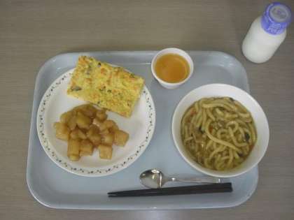 ・カレーうどん ・牛乳 ・千草焼き ・じゃがいもの甘辛煮 ・キャロットゼリー です。
