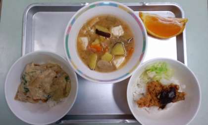 ・カツ丼(卵かみそ) ・牛乳 ・さつま汁 ・くだもの(デコポン) です。
