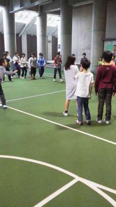 同宿校の池尻小と一緒にドッチボール大会をしています。自己紹介をした後、大会は大盛り上がりです。