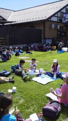田園プラザでお弁当を食べています。さわやかな風が吹いています。