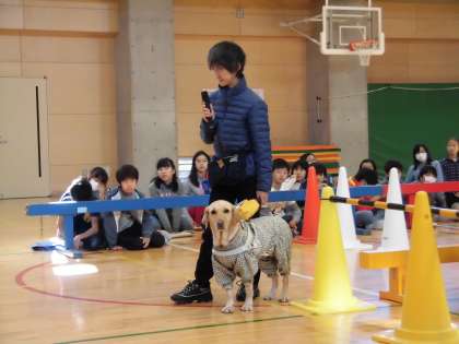 日本盲導犬協会の方と盲導犬ユーザー、そして盲導犬のエリーさんをお招きして、盲導犬に関する授業をしてしていただきました。まず、視覚障害の疑似体験をし、その後、代表の児童がアイマスクをして手引き歩行を体験しました。体験した児童は「自分がどこにいるのかわからなくなった。手を引いて声をかけてもらうと安心した。」と感想を述べていました。次に、盲導犬の仕事、育成についての話を聞き、その仕事ぶりを実際に見せていただきました。子どもたちは、おとなしく仕事を行うエリーさんに感心していました。