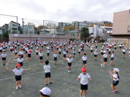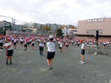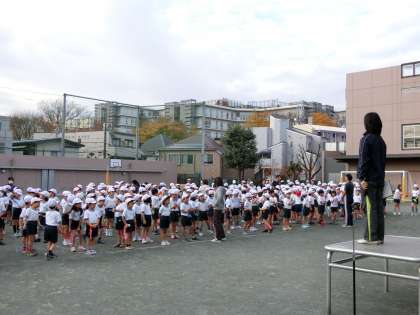 体育朝会で、全校の子どもたちが「短縄跳び」に取り組みました。初めに3分間の持久跳びに挑戦。途中で引っかかってしまっても、全員が最後まで根気よく跳び続けました。その後は、運動委員会の子どもたちを手本に「あや跳び」「前振り跳び」などの技に挑戦しました。子どもたちはみな元気に頑張っていました。