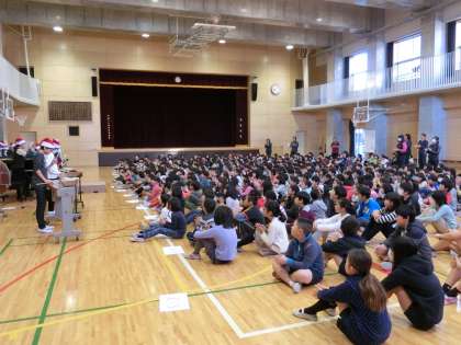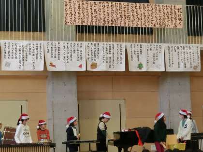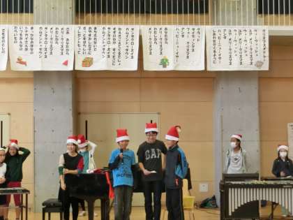 今朝の音楽集会は、「クリスマスメドレー」でした。クリスマスソングアンケートの集計から、人気の高かった3曲をメドレーで歌いました。第3位は「赤鼻のトナカイ」第2位は「サンタが町にやってくる」そして第1位は「ウィウィッシュユアメリークリスマス」てした。サンタ帽を被った器楽クラブの子どもたちが、演奏でクリスマス気分を盛り上げ、みんなで心弾む歌声を合わせました。楽しい素敵な朝でした。