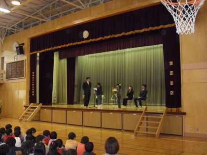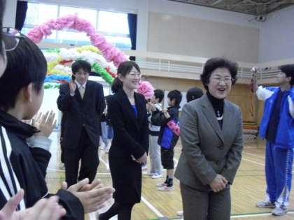 離任された先生が入場されると子供たちの歓声でいっぱいになりました。懐かしさ、うれしさ、さみしさなどいろいろな気持ちがこみ上げ、満開の笑顔や照れた笑顔、涙であふれました。