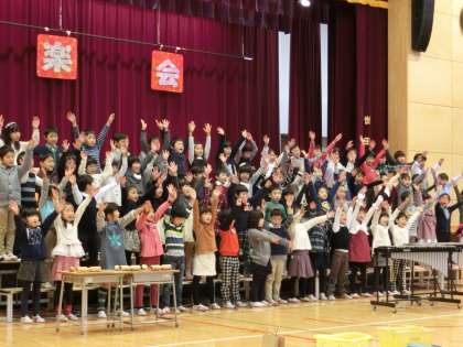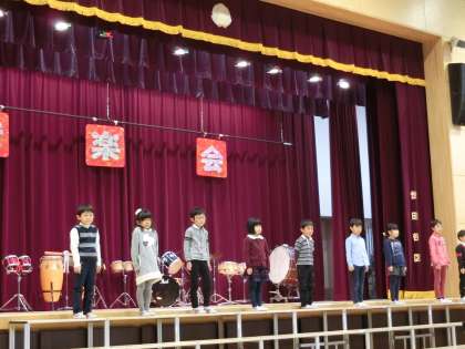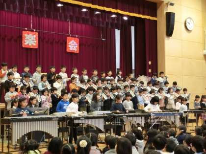 音楽会の日。子どもたちは、わくわくドキドキ。1年生代表の「はじめのことば」からプログラムが始まりました。1年生の歌「花丸ロックンロール」は、1年生にピッタリな歌で、みんなノリノリでした。2年生「うさぎ野原のクリスマス」は、歌声がメロディーを流れるようにつなげていました。