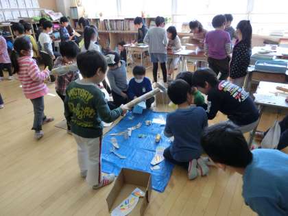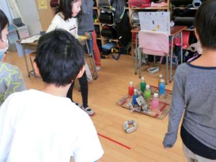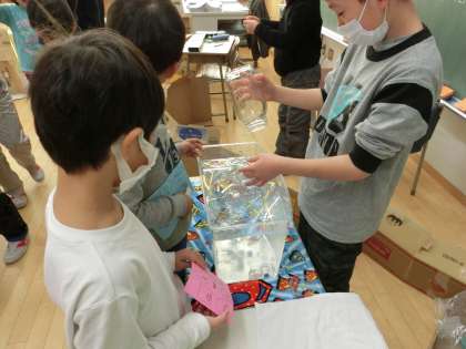 今日の2・3時間目は「にこにこランド」が開かれました。2年生がグループに分かれてお店屋さんを計画します。そして1年生を招待して、みんなで一緒に楽しむという催しです。1年生を楽しませようと、2年生は時間をかけて話し合い、工夫・改良に取り組んできました。「魚つり」「輪投げ」「射的」「おみくじ」などなど。1年生の笑顔いっぱい「にこにこランド」になりました。