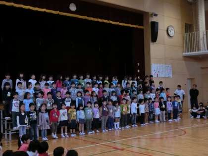15日(金)に「1年生を迎える会」が行われました。6年生に手を引かれた1年生が、花のアーチをくぐって入場しました。ひな壇に並んだ1年生に、各学年から呼びかけや歌、○×クイズ、なかよし班バッチなど、歓迎の楽しい出し物やプレゼントが贈られました。1年生からもお礼の呼びかけやかわいい歌のお返しがあり、体育館には温かな優しい気持ちがあふれました。上北沢小学校の大切な子どもたちがみんなそろって、素敵な朝になりました。