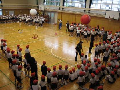 5月24日(月)運動会の全校練習を行いました。体育館での練習です。応援合戦や大玉送りの練習をし、子どもたちの元気な声が、体育館いっぱいに響きました。今週は、八幡山小学校で練習する予定です。