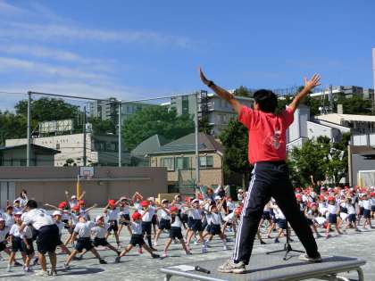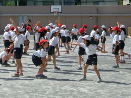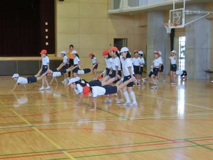 今朝は、「体育朝会」がありました。1〜4年生は校庭、5・6年生は体育館で、元気いっぱい体を動かしました。大きくしっかりと準備運動を行った後、全身じゃんけんや押し相撲、手押し車などの「体つくり運動」に取り組みました。朝から体を動かすことは、健康面・学習面ともによい効果があり、よい1日のスタートになります。子供たちは、さわやかな表情をしていました。