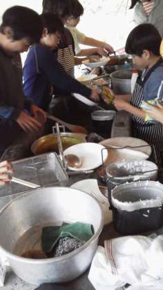 鍋や飯ごうを、ピカピカになるまで磨きます。みんなで手分けをして、片付けを頑張りましょう。