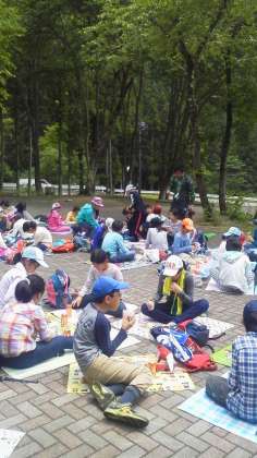 21世紀の森から帰ってきました。ビレジの前庭で、お弁当を食べています。