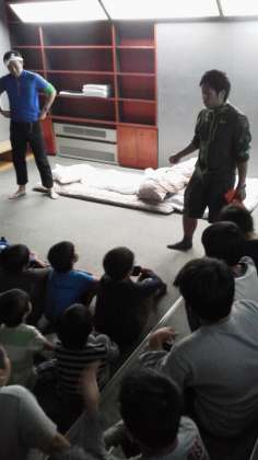 大興奮の肝試しが終わりました。次は、明朝の寝具の片付け方の説明を聞いています。