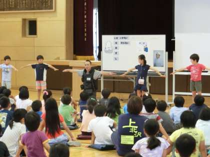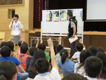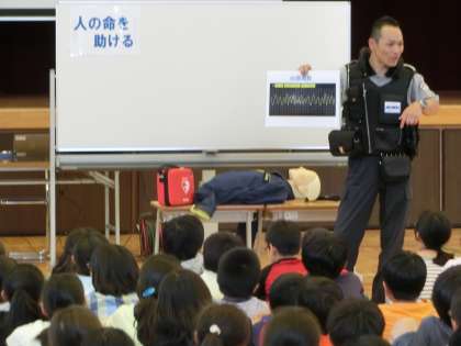アルソックALSOk(綜合警備保障)の方を講師にお招きして「セーフティ教室」を開催しました。低学年は「安心して登下校」中学年は「安心してお留守番」高学年は「人の命を助けるって何だろう」というテーマでした。低学年は危機回避の心構えである[いかのおすし]を、中学年は留守番の心構えである[いいゆだな]と[電話対応]を、高学年は[119番通報・AEDの使い方]を学びました。