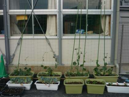 今年度は、仮校舎の壁面を利用し、ヘチマのつるを這わせ、