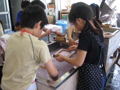 体験したことは、牛乳パックをはぐこと、紙の原料となるこうぞをたたいてやわらかくすること、はがきつくりの3つです。工芸室の先生方に教えていただきながら、興味を持って取り組みました。自分で漉いたはがきをお土産にいただきました。子どもたちは、「楽しかった」「おじいちゃんの誕生日にはがきを送ろう」など、嬉しそうでした。