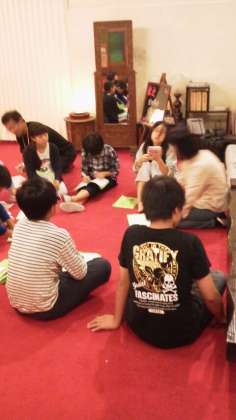 今日を振り返り、話し合いをしています。この後、明日の予定を聞いて班のみんなに伝えます。