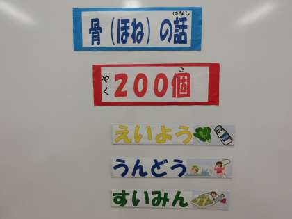 今日から「身体計測」が始まりました。学級ごとに子供一人一人の身長や体重の変化を計測し記録していきます。計測の前には、養護教諭より「保健指導」が行われます。学年の発達段階や計測実施時期に合わせて、短い時間ですが健康に関する大切な内容を伝えています。今回の低学年は「骨の話」です。骨の数や丈夫な骨を作るための生活などについての話を、子供たちは興味深くしっかりと聞いていました。