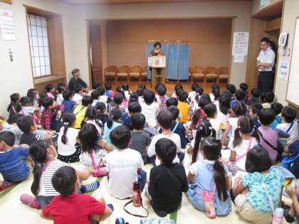始めに、担当の方から図書館の施設概要や、利用のしかたなどを紙芝居で教えていただきました。