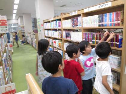 その後、一般利用者の方々が大勢いらっしゃる中、クラスごとに図書館内を案内していただきました。お互いに注意し合いながら、静かに図書館内を回ることができました。そして、1人1冊本を選んで借りて帰りました。