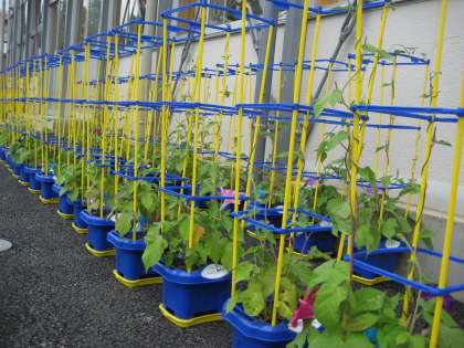 仮設の校庭でも、子どもたちの栽培活動を大切にしています。1年生の朝顔、2年生のキュウリやナスやトマトなどが大きく育っています。フラワースクールとして取り組んでいる各学年の花作りも順調に進み、まいた種から芽が出てつぼみをつけ、花が咲き始めました。