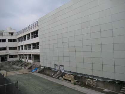 6月から旧校舎の解体工事が始まっています。校舎内部の解体が終わり、周りをフェンスですっぽり覆って、校舎本体の解体が始まりました。安全には十分に気をつけて進めています。