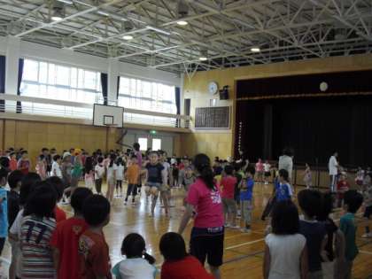 体育館では1〜4年生が、校庭では5,6年生が長縄跳びをしました。7月の長縄大会に向けての練習になりました。各クラス3分間で跳んだ数を測りました。最高記録は6年2組の208回でした。