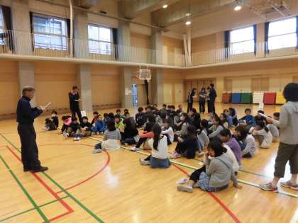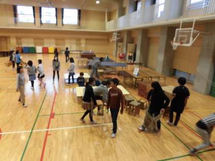 本日の6校時に、6年生が展覧会の会場設営を手伝ってくれました。校舎中からテーブルや机、椅子、パネルなどを協力して体育館に運び込みました。