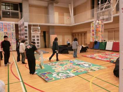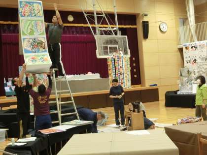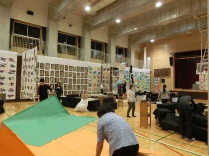 11月14日(月)午後7時の体育館です。多くの先生たちが、協力して展覧会の作品を展示しています。子供たちの平面作品一つ一つを丁寧に張り合わせたり、立体作品を展示するための台を作って布をかぶせたりしています。午後3時くらいから始まった作業は、まだ終わりません。体育館は冷え込んできましたが、先生たちは熱心に作業を続けています。