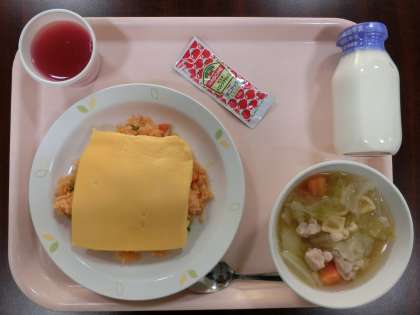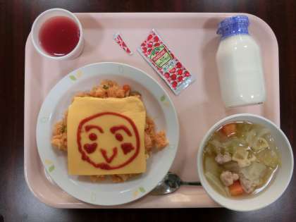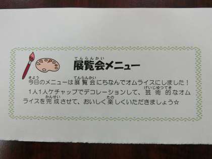 展覧会の今日、給食室からも展覧会を盛り上げてくださいました。その名も「展覧会メニュー」です。献立は、オムライス・マカロニスープ・ぶどうゼリー・牛乳です。さあ、どこが「展覧会メニュー」なのでしょうか。子供たちは、大喜びでした。