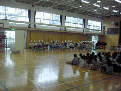 9日(金)の朝の時間に、1年生が学年発表で「おおきなかぶ」の音読と歌を発表しました。子どもたちは、おじいさん、おばあさん、まご、いぬ、ねこ、ねずみの役をそれぞれ担当し、声をそろえてがんばりました。発表後の子どもたちに感想を聞くと、「たくさんの人の前で発表したので緊張しました。」という声が多かったです。また一つ、大きく成長できた1年生の姿でした。