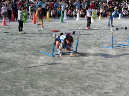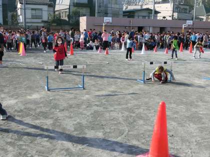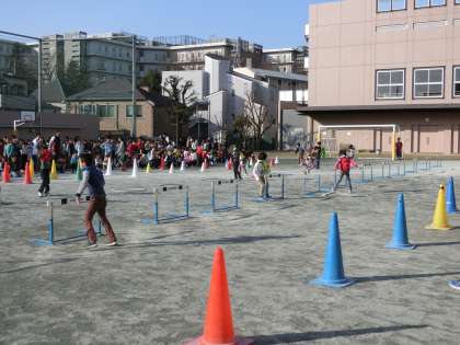 今月の児童集会は、「障害物リレー競争」です。なかよし班に分かれてチームを組み、ジグザグ走やハードルくぐりなどをしながらリレーをします。ゼッケンが上手に着られない下級生を上級生が手伝ったり、上級生のことを大きな声で応援する下級生がいたり。朝の短いひとときでしたが、ほほえましい時間でした。